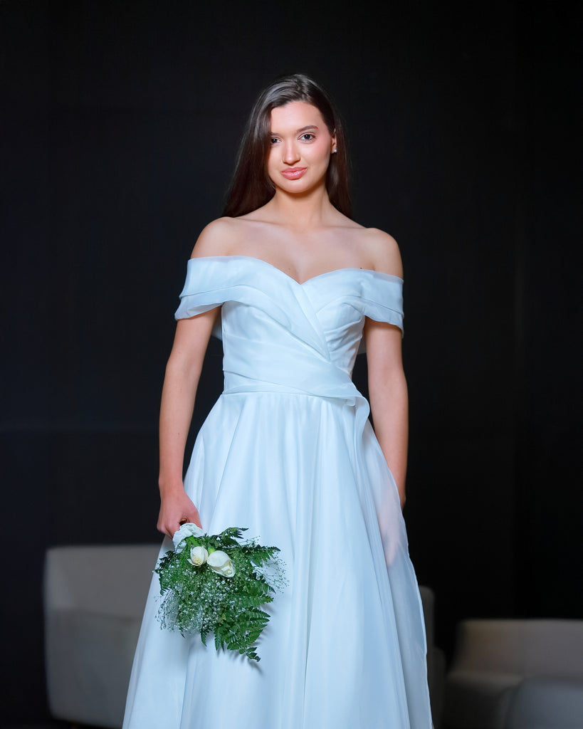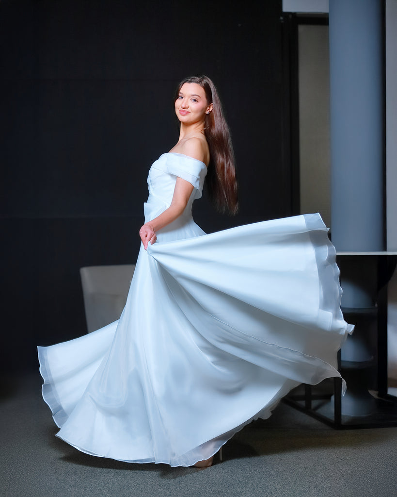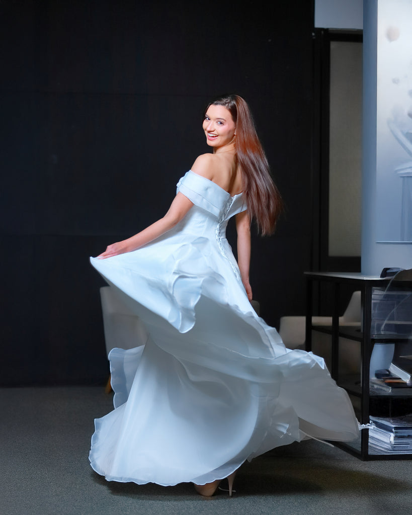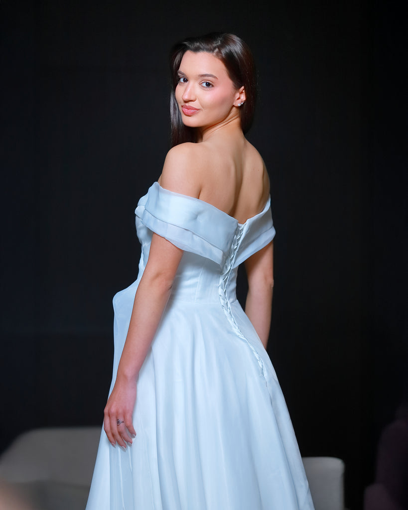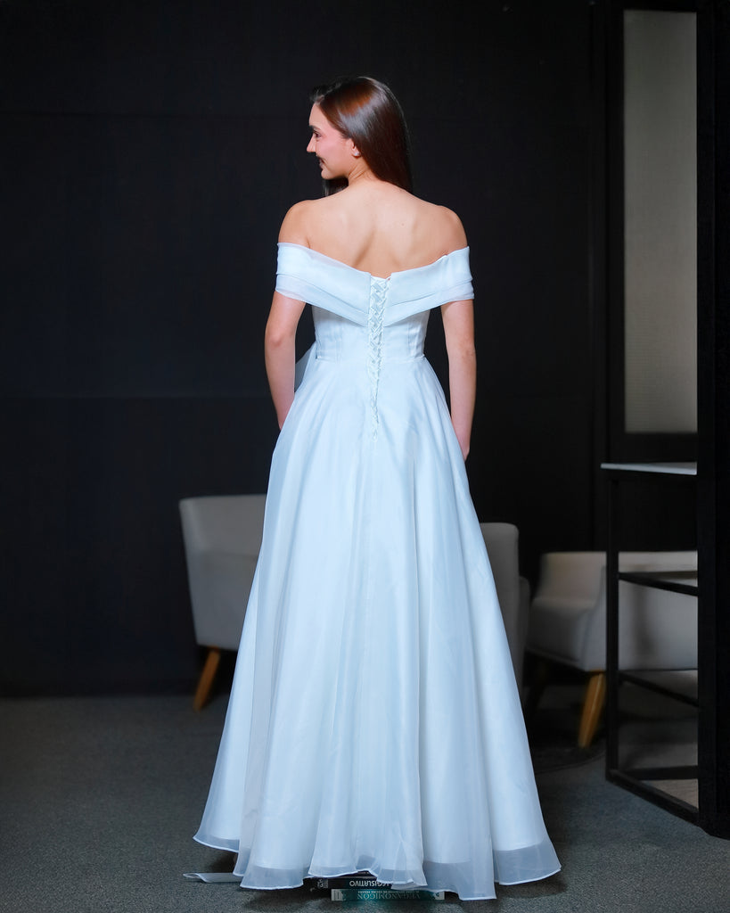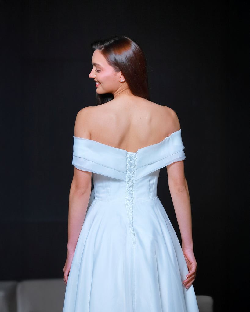 Vestido de novia o de 15 años de línea simple y muy fino y delicado con un importante escote que termina con la caída de un lazo dándole terminación a la falta amplia