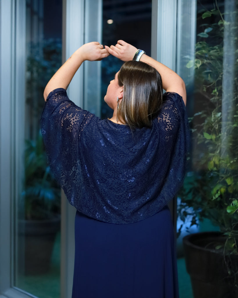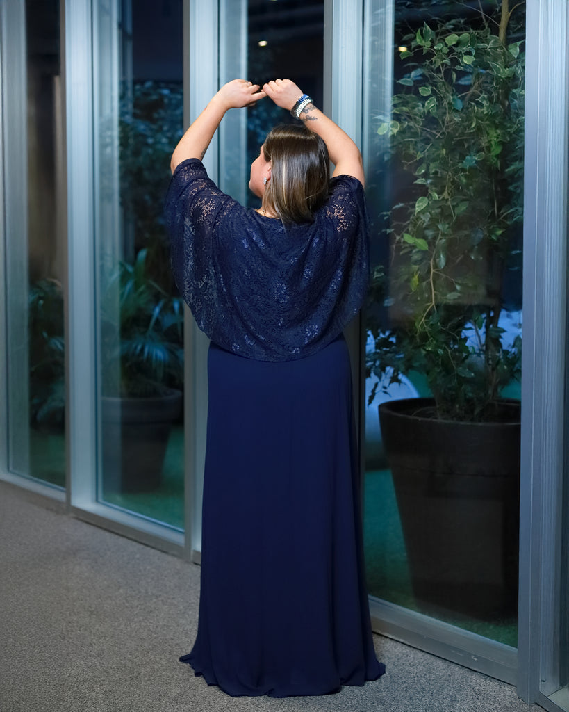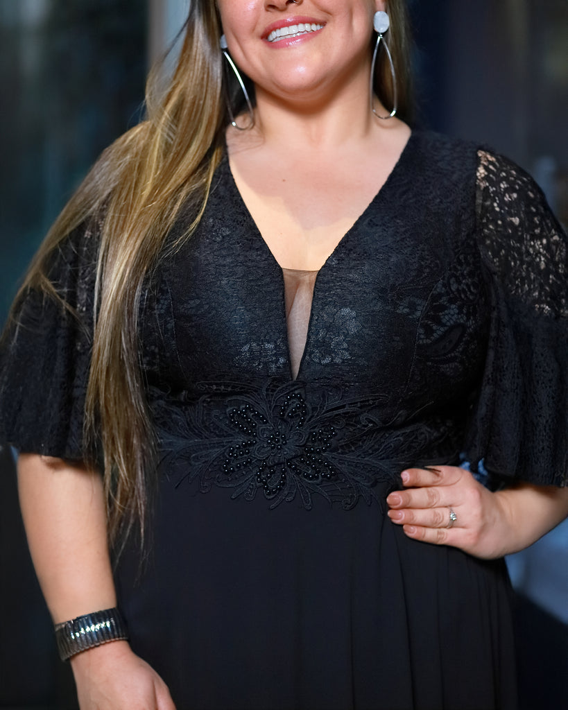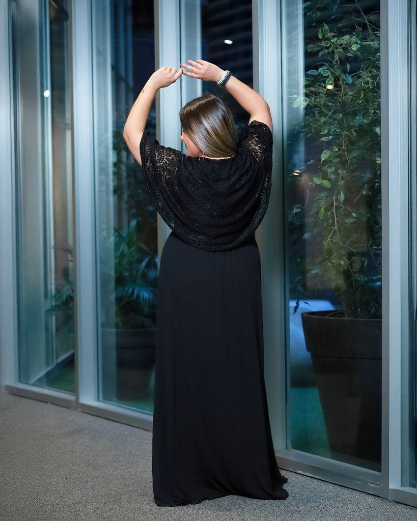 Vestido de gasa largo con mangas tipo capa de encaje y espalda elastizada